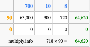 Below is an illustration showing you how to calculate 718 times 90 using the box method, using the instructions above.