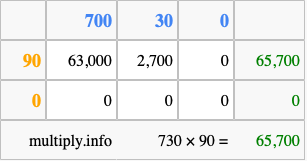 That's all there is to it! As you can see from the box above, the answer to 730 times 90 using the box method is 65,700.