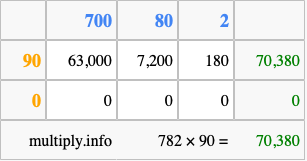That's all there is to it! As you can see from the box above, the answer to 782 times 90 using the box method is 70,380.
