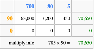 That's all there is to it! As you can see from the box above, the answer to 785 times 90 using the box method is 70,650.