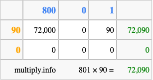 Below is an illustration showing you how to calculate 801 times 90 using the box method, using the instructions above.