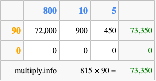 That's all there is to it! As you can see from the box above, the answer to 815 times 90 using the box method is 73,350.