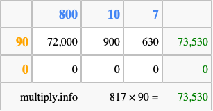 That's all there is to it! As you can see from the box above, the answer to 817 times 90 using the box method is 73,530.