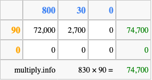That's all there is to it! As you can see from the box above, the answer to 830 times 90 using the box method is 74,700.