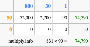 That's all there is to it! As you can see from the box above, the answer to 831 times 90 using the box method is 74,790.
