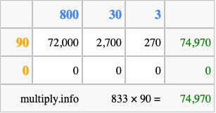 Below is an illustration showing you how to calculate 833 times 90 using the box method, using the instructions above.