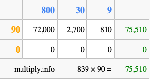 Below is an illustration showing you how to calculate 839 times 90 using the box method, using the instructions above.