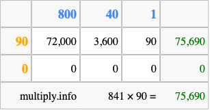 That's all there is to it! As you can see from the box above, the answer to 841 times 90 using the box method is 75,690.