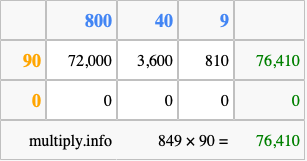 Below is an illustration showing you how to calculate 849 times 90 using the box method, using the instructions above.