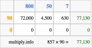 Below is an illustration showing you how to calculate 857 times 90 using the box method, using the instructions above.