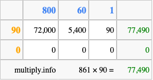 Below is an illustration showing you how to calculate 861 times 90 using the box method, using the instructions above.
