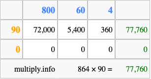 That's all there is to it! As you can see from the box above, the answer to 864 times 90 using the box method is 77,760.