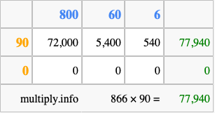 Below is an illustration showing you how to calculate 866 times 90 using the box method, using the instructions above.