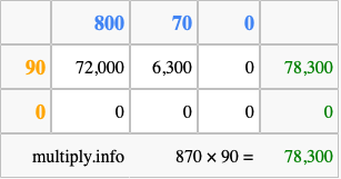 That's all there is to it! As you can see from the box above, the answer to 870 times 90 using the box method is 78,300.