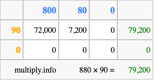 That's all there is to it! As you can see from the box above, the answer to 880 times 90 using the box method is 79,200.
