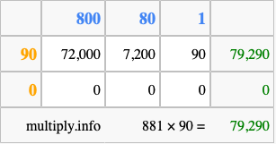 Below is an illustration showing you how to calculate 881 times 90 using the box method, using the instructions above.