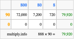 Below is an illustration showing you how to calculate 888 times 90 using the box method, using the instructions above.