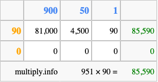 Below is an illustration showing you how to calculate 951 times 90 using the box method, using the instructions above.