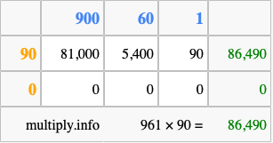 Below is an illustration showing you how to calculate 961 times 90 using the box method, using the instructions above.