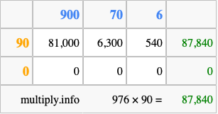 Below is an illustration showing you how to calculate 976 times 90 using the box method, using the instructions above.