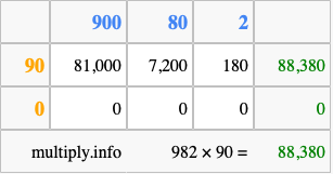 Below is an illustration showing you how to calculate 982 times 90 using the box method, using the instructions above.