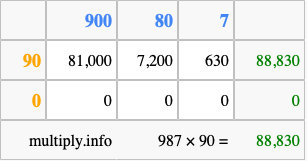 That's all there is to it! As you can see from the box above, the answer to 987 times 90 using the box method is 88,830.