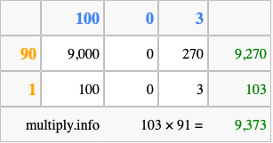 Below is an illustration showing you how to calculate 103 times 91 using the box method, using the instructions above.