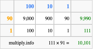 That's all there is to it! As you can see from the box above, the answer to 111 times 91 using the box method is 10,101.