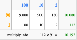 Finally, we add up all the sums we found in step 3 to get our final answer to 112 times 91.