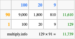 That's all there is to it! As you can see from the box above, the answer to 129 times 91 using the box method is 11,739.