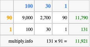 Below is an illustration showing you how to calculate 131 times 91 using the box method, using the instructions above.