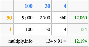Finally, we add up all the sums we found in step 3 to get our final answer to 134 times 91.