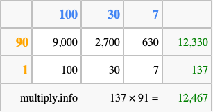 Finally, we add up all the sums we found in step 3 to get our final answer to 137 times 91.