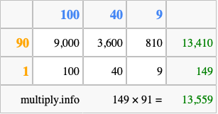 Below is an illustration showing you how to calculate 149 times 91 using the box method, using the instructions above.