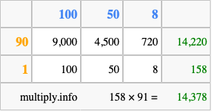 That's all there is to it! As you can see from the box above, the answer to 158 times 91 using the box method is 14,378.