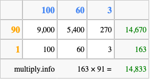 That's all there is to it! As you can see from the box above, the answer to 163 times 91 using the box method is 14,833.