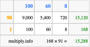 Below is an illustration showing you how to calculate 168 times 91 using the box method, using the instructions above.
