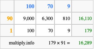 That's all there is to it! As you can see from the box above, the answer to 179 times 91 using the box method is 16,289.