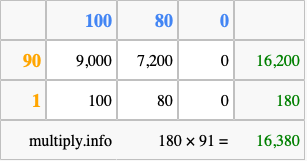 That's all there is to it! As you can see from the box above, the answer to 180 times 91 using the box method is 16,380.