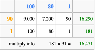 That's all there is to it! As you can see from the box above, the answer to 181 times 91 using the box method is 16,471.