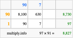 That's all there is to it! As you can see from the box above, the answer to 97 times 91 using the box method is 8,827.