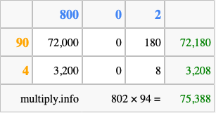That's all there is to it! As you can see from the box above, the answer to 802 times 94 using the box method is 75,388.