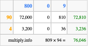 Finally, we add up all the sums we found in step 3 to get our final answer to 809 times 94.