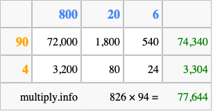 Below is an illustration showing you how to calculate 826 times 94 using the box method, using the instructions above.