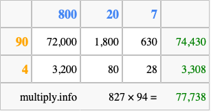 That's all there is to it! As you can see from the box above, the answer to 827 times 94 using the box method is 77,738.