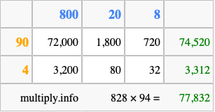 Below is an illustration showing you how to calculate 828 times 94 using the box method, using the instructions above.