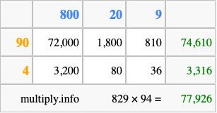 Below is an illustration showing you how to calculate 829 times 94 using the box method, using the instructions above.