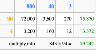Finally, we add up all the sums we found in step 3 to get our final answer to 843 times 94.