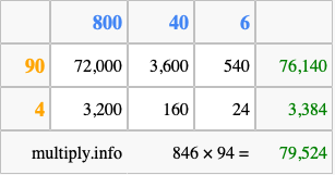Below is an illustration showing you how to calculate 846 times 94 using the box method, using the instructions above.
