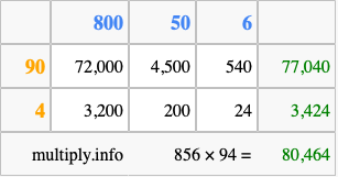 That's all there is to it! As you can see from the box above, the answer to 856 times 94 using the box method is 80,464.